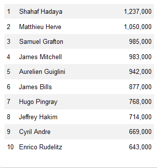 Στο τέλος της ημέρας chip leader αναδείχτηκε ο Shahaf Hadaya που συγκέντρωσε 1.237.000 μάρκες. Ο Hadaya κατάγεται από το Ισραήλ και μετράει ήδη αρκετά cashes από live τουρνουά στην καριέρα του, το μεγαλύτερο εκ των οποίων είχε φτάσει τα $30,920.