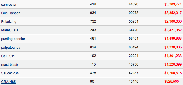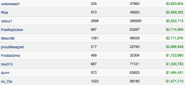 Η χθεσινή ημέρα για τον "proudlikeagoat" ήταν ονειρική αφού απέσπασε πάνω από $600.000 στο $400/$800. Έτσι βρίσκεται πλέον λίγο πίσω από τον Rjhe, ο οποίος έχει κερδίσει ένα μέσα στο ίδιο διάστημα και εκείνος $2.8 εκατομμύρια.
