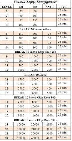 Την δομή των blinds που θα αυξάνονται κάθε 25 λεπτά μπορείτε να την δείτε στο gallery.