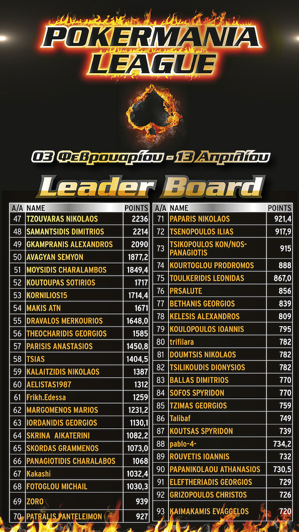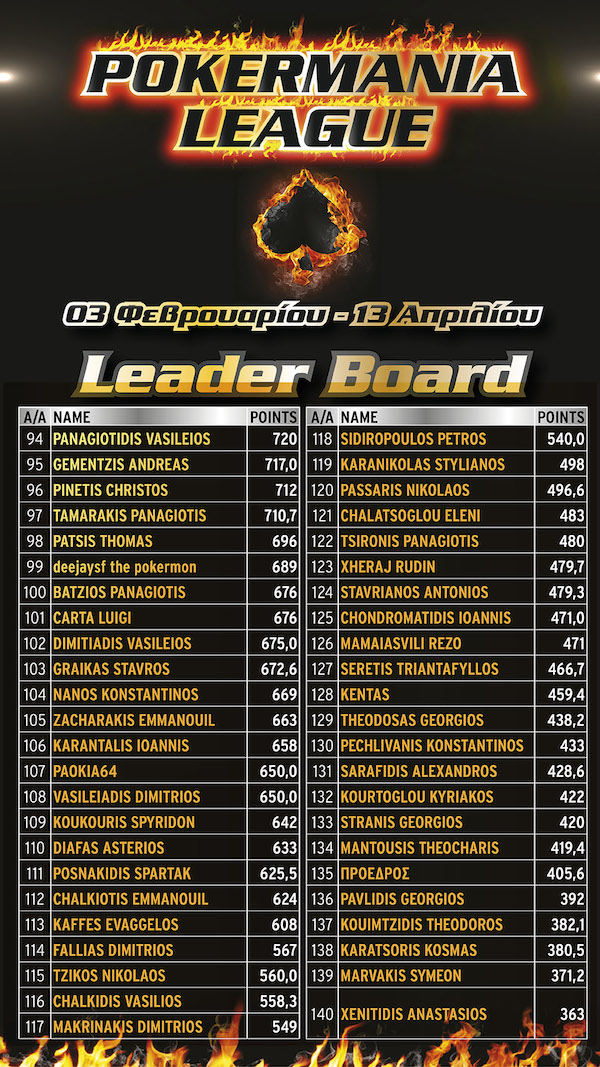 Δείτε τη βαθμολογία πως έχει διαμορφωθεί μετά και το χθεσινό τουρνουά: