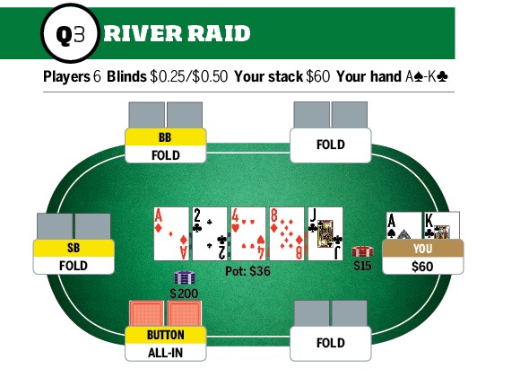 Ερώτηση 3: Σε ένα online cash game των $50 (blinds $0.25/$0.50), σε τραπέζι με φυσιολογικούς παίκτες. Κάνουμε raise με Α-Κ και δεχόμαστε έναν caller από το button, ο οποίος έχει μεγάλο stack. Το flop ανοίγει A24, ποντάρουμε και δεχόμαστε call. Στο turn ποντάρουμε και κάνει πάλι call ο αντίπαλος ενώ στο river σε pot $21 ποντάρουμε $15 και ο αντίπαλος μας βάζει all in. Τι κάνουμε;