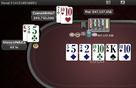 Ο Coenaldinho7 έκανε check και ο αντίπαλός του πόνταρε 2.000.000 μάρκες. Ο Coenaldinho7 ανέβασε στα 6.000.000 και ο AlwaysiNduCe έκανε το call. Το turn ήταν K και ο Coenaldinho7 αυτή τη φορά πόνταρε 15.000.000 μάρκες. Ο AlwaysiNduCe που είχε μείνει με 15,468,728 μάρκες μπήκε all in και ο αντίπαλός του έκανε το call.