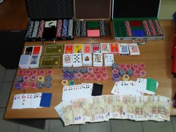 Στον έλεγχο που ακολούθησε εντοπίστηκαν και κατασχέθηκαν 1215 ευρώ σε μετρητά, 1380 μάρκες διαφόρων χρημάτων, 25 τράπουλες καθώς και τα ειδικά διαμορφωμένα τραπέζια με την πράσινη τσόχα.