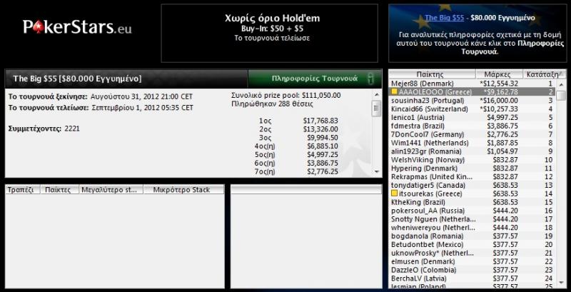 O Έλληνας παίκτης ξεχώρισε μέσα από ένα field 2221παικτών, αποκομίζοντας χρηματικό έπαθλο $9,162 έπειτα από deal.