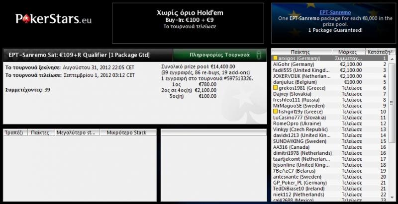 Τέλος, ο Κωνσταντίνος “arxigos” Νάνος κατάφερε να κατακτήσει τον χθεσινό re-buy τελικό των $109 για το EPT San Remo και κατέκτησε ένα πακέτο για την μεγαλύτερη Ευρωπαική διοργάνωση!