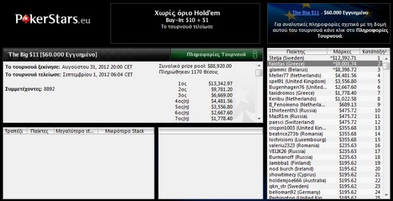 Παρόμοιο χρηματικό έπαθλο κατάφερε να κερδίσει και ο falotas ο οποίος τερμάτισε στην δεύτερη θέση του The Big $11 και πρόσθεσε στον λογαριασμό του στο PokerStars το ποσό των $9,001 έπειτα από deal.