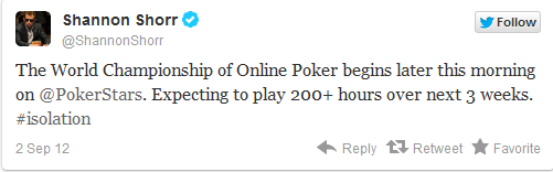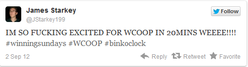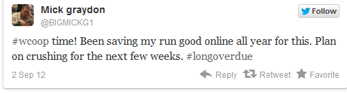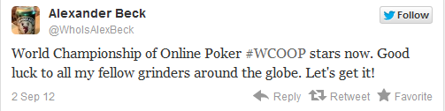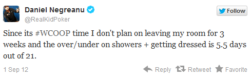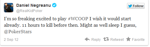 Ο Daniel Negreanu, έντεκα ώρες πριν την έναρξη του WCOOP έγραψε: «είμαι τόσο ενθουσιασμένος που ξεκινάει το WCOOP που εύχομαι να ξεκίναγε τώρα». Μιας και δεν μπορούσε να γυρίσει τους δείκτες του ρολογιού τελικά κοιμήθηκε για να περάσει η ώρα πιο γρήγορα. Λίγο αργότερα επέστρεψε με νέο tweet όπου έλεγε πως δεν πρόκειται να βγει από το δωμάτιό του τις επόμενες τρεις εβδομάδες.