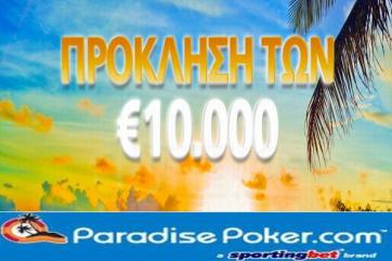 Με μία νέα μεγάλη πρόκληση επέστρεψε το Paradise Poker και αυτή το φορά, δίνει την ευκαιρία σε όλους εσάς κάθε Κυριακή να διεκδικήσετε έξτρα χρηματικό έπαθλο €10,000!