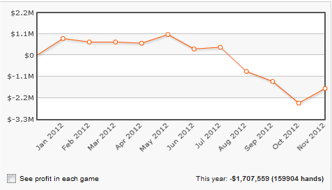 Από τις αρχές του 2012 και μέχρι τα μέσα Φεβρουαρίου ο patpatman είδε τα κέρδη του να ξεπερνούν το ένα εκατομμύριο δολάρια και τα διατήρησε σε αυτά τα επίπεδα μέχρι και τον Μάιο οπότε και άρχισε ένα «τρελό» downswing. Το αποτέλεσμα ήταν μέσα στους επόμενους πέντε μήνες, μέχρι τον Οκτώβριο ο patpatman όχι μόνο τα έχασε όλα όσα είχε κερδίσει αλλά είδε και τις απώλειές του να ξεπερνούν τα $2,5 εκατομμύρια. Ο patpatman κατάφερε να κλείσει τον Νοέμβριο με κέρδη ύψους $900.000 με τα $500.000 εκ των οποίων να τα κερδίζει τις τελευταίες 10 ημέρες.