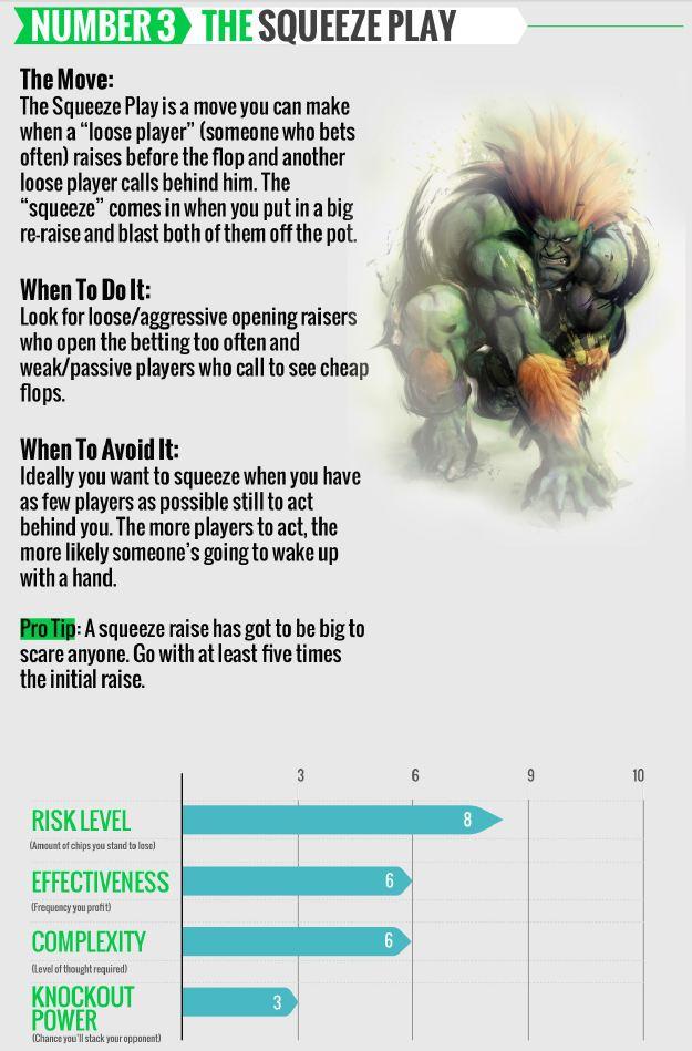 Μην το κάνετε: Ιδανικά, προτιμήστε να κάνετε squeeze play όταν απομένουν κατά το δυνατόν λιγότεροι παίκτες να δράσουν μετά από σας. Όσο πιο πολλοί παίκτες είναι μπροστά σας, τόσο πιο πολλές πιθανότητες έχετε να βρεθείτε αντιμέτωποι με ένα καλό χέρι, για το οποίο δεν έχετε πληροφορίες. Επίσης προσέξτε τα stacks των αντιπάλων σας.