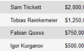 Ο Kurganov αποκλείστηκε στην 4η θέση όταν το flop ήταν 932 και στο χέρι συμμετείχε εκείνος και ο Sam Trickett. Ο Kurganov έκανε check και ο Trickett πόνταρε 80.000 μάρκες. Ο αντίπαλός του έκανε το call και στο turn εμφανίστηκε το 4.