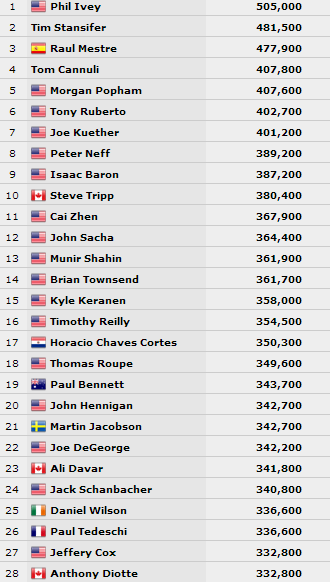 Ο Ivey θα μπει στην Day 3 του τουρνουά ως ο παίκτης με τις περισσότερες μάρκες μιας και ο Tim Stansifer που αναδείχτηκε chip leader της Day 2a/b θα επιστρέψει με ένα stack ύψους 481.500.
