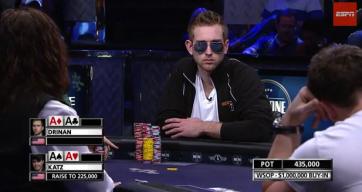 Και οι δύο παίκτες κράταγαν άσσους και ενώ όλοι νόμιζαν πως το pot θα μοιραζόταν, το board χάρισε χρώμα στον Cary Katz και έστειλε τον Connor Drinan στο rail.
