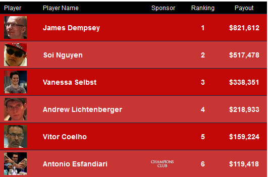Όπως συμβαίνει πάντα στο Bellagio,έτσι και φέτος το τελικό τραπέζι είχε κάποιους από τους καλύτερους παίχτες πόκερ. Ανάμεσά τους ήταν ο περσινός νικητής του event και δύο φορές κατακτητής WPT, Antonio Esfandiari, ο November Niner Soi Nguyen, το φαινόμενο του online πόκερ Andrew Lichtenberger και η Vanessa Selbst που έχει κερδίσει βραχιόλι σε WSOP και πολλούς ακόμη τίτλους.