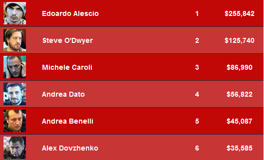 Μέσα σε πολύ λίγο χρόνο από την έναρξη του τελικού τραπεζιού ο O’Dwyer έβγαλε εκτός παιχνιδιού τον Alex Dovzhenko στην έκτη θέση και στην συνέχεια απέκλεισε τον Andrea Benelli στην πέμπτη θέση. Τίποτα δεν μπορούσε να σταματήσει τον Steve O’Dwyer ο οποίος έβγαλε εκτός μάχης και τον Andrea Dato στην τέταρτη θέση και κέρδισε ένα μεγάλο pot από τον Alescio. Όταν πια είχαν μείνει στο τραπέζι τρεις παίχτες ο O’Dwyer ήταν ο chip leader και με μεγάλη διαφορά.