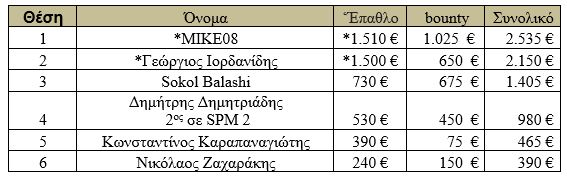 Ο Mike08 και ο Γιώργος Ιορδανίδης πήραν από €1500 ευρώ και φυσικά εξαργύρωσαν τα bounty που είχαν κερδίσει. Περισσότερα από €1000 μοιράστηκαν από τα bounty και σε παίκτες που δεν μπήκαν στα έπαθλα.