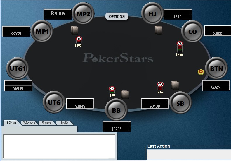 Όταν ξεκινάει η παρτίδα, υπάρχει το small blind και το big blind. Στο παρακάτω παράδειγμα ο παίκτης που θα επιλέξει να ξεκινήσει τη δράση κάνει raise από MP2.