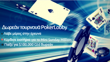 Στις 30 Ιουλίου το PokerLobby διοργανώνει ένα freeroll τουρνουά στην PokerStars το οποίο θα μοιράσει 8 εισιτήρια, αξίας $22 το καθένα για το Mini Sunday Million, το κυριακάτικο τουρνουά που προσφέρει εγγυημένο έπαθλο $100.000.