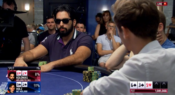 Λίγο αργότερα ο Κολώνιας κατάφερε να κερδίσει μια σημαντική παρτίδα από τον Fedor Holz όταν έκανε raise με KQ και ο αντίπαλός του υπερασπίστηκε με 98 από το big blind. Το φλοπ ήρθε A58 και ο Κολώνιας πόνταρε 250.000 μετά το check του Holz. Ο Γερμανός έκανε το call και το turn ήταν το 2, δίνοντας flush draw στον Έλληνα παίκτη. Check από τον Holz και ο Κολώνιας αποφάσισε να ποντάρει 400.000, αφήνοντας περίπου 1.700.000 πίσω του. Δύσκολο board για να προβάλει μεγαλύτερη αντίσταση ο Holz που πήγε τελικά πάσο, δίνοντας ένα σημαντικό ποτ στον Έλληνα παίκτη.