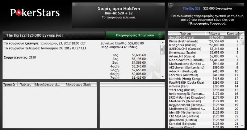 Συνεχίζουμε με το The Big $22 στο οποίο έλαβαν μέρος 2950 παίκτες και κατέληξε σε ελληνικά χέρια.