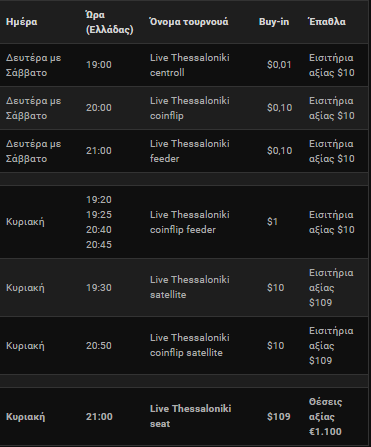 Αν πιστεύετε στην τύχη καθημερινά από την Δευτέρα μέχρι το Σάββατο στις 20.00 στην πλατφόρμα της bwin σας περιμένουν coinflip τουρνουά με $0.10 που μοιράζουν εισιτήρια για τους προκριματικούς των $10 ενώ, τις ίδιες ημέρες, μια ώρα αργότερα, στις 22.00 μπορείτε με $0.10 να κερδίσετε μια θέση στα satellites των $10 μέσα από τα τουρνουά Live Thessaloniki feeder.