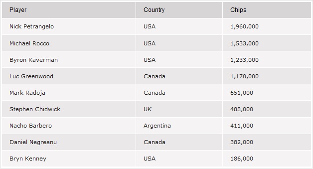Η δράση σταμάτησε με το σχηματισμό του τελικού τραπεζιού των 9 και τον Αμερικανό Nick Petrangelo να διατηρεί το chip lead για 2η συνεχόμενη ημέρα, έχοντας πλέον 1.960.000 μάρκες στην κατοχή του.