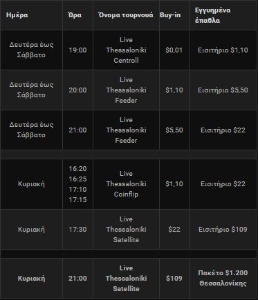 ♦ Μία ώρα αργότερα, στις 20.00, τις ίδιες ημέρες θα ξεκινούν τα τουρνουά που με $1.10 προσφέρουν θέσεις στα satellites των $5.50.
