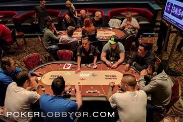 Εκτός συνέχειας στα επόμενα levels τέθηκαν οι Απόστολος Μπεχράκης, Συμεών Μαρβάκης, Γιώργος Λεκκάκος και Νίκος Καρκάς. Ακολούθησε τριπλό κερδισμένο all-in για τον Κωνσταντίνο Νάνο που κρατούσε AK απέναντι σε J9 και KK, με το board να έρχεται J9T7Q.