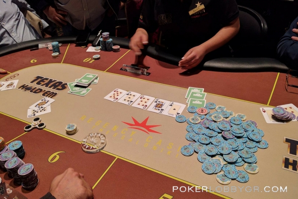 Ο Λαμπρόπουλος έχασε το stack του με JJ από το small blind απέναντι στο AA του Κυριάκου Παπαδόπουλου από το big blind, με αποτέλεσμα να αποχωρήσει στην 5η θέση για €7.400.