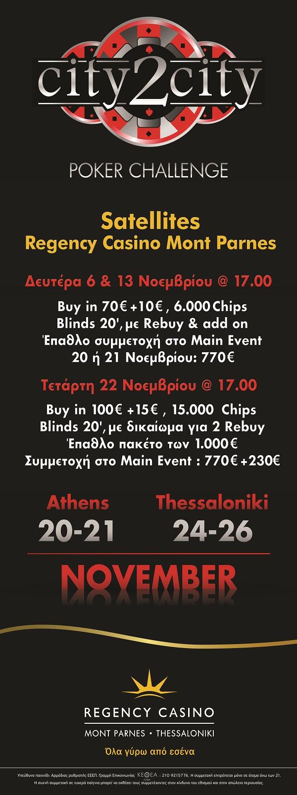 Την Τετάρτη 8 Νοεμβρίου και την Τετάρτη 15 Νοεμβρίου στο Regency Casino Thessaloniki θα πραγματοποιηθούν satellites με εισιτήρια αξίας €700+€70 το καθένα για την Day 1c του City 2 City Poker Challenge.