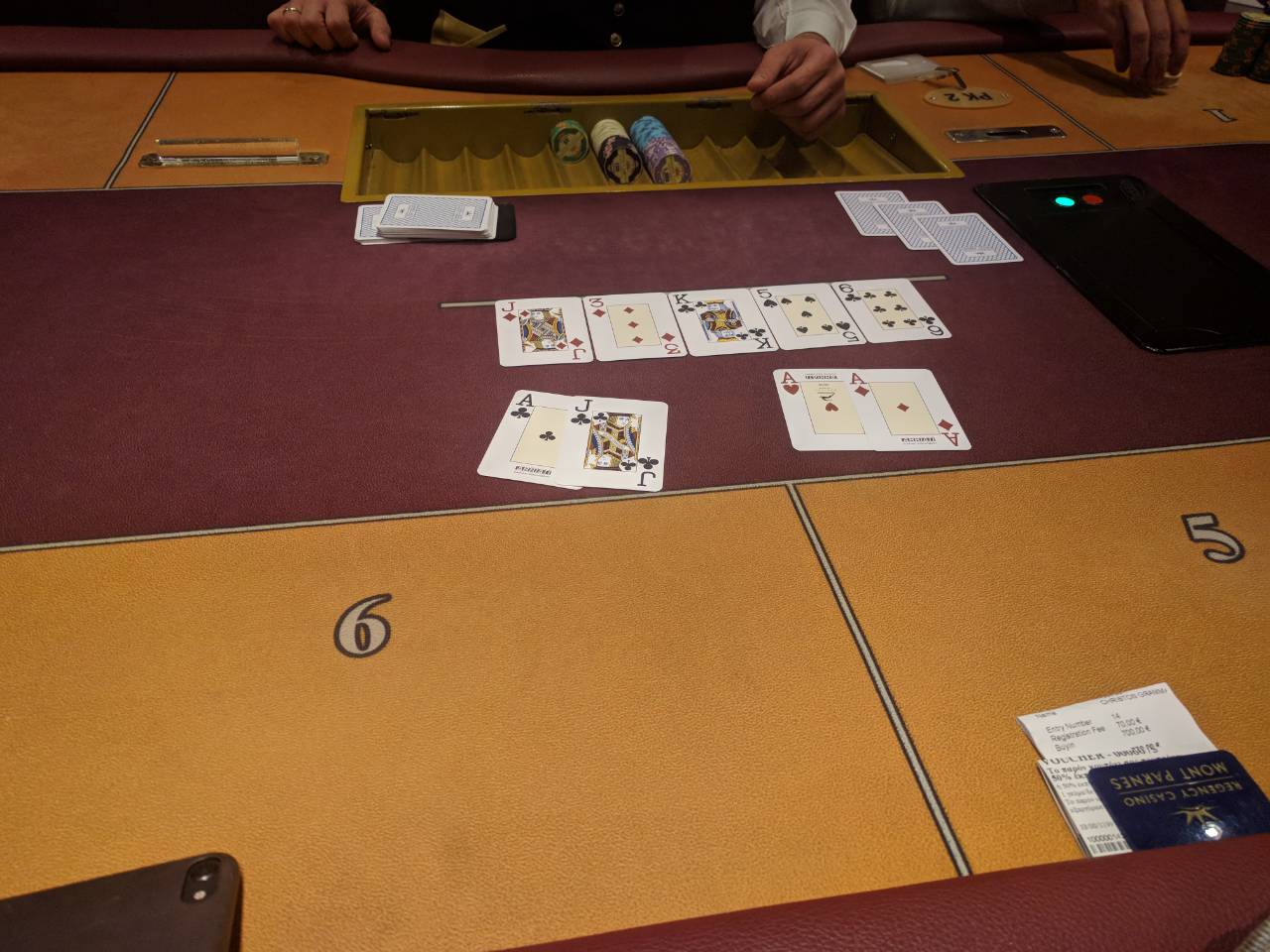 Οι δυο παίκτες βρέθηκαν all in preflop με τον Πιλαφά να ανοίγει άσσους και τον Πέττα να κρατάει ντάμες.