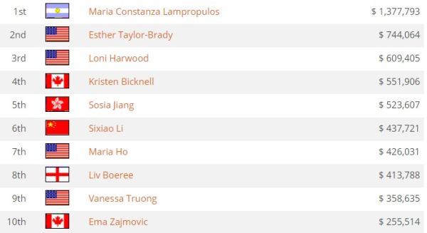 Αυτά τα έπαθλα την έφεραν στην κορυφή της λίστα των γυναικών με τα περισσότερα έπαθλα το 2017, αφήνοντας στη δεύτερη θέση την Esther Taylor-Brady με έπαθλα $744.064.