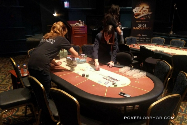 Αυτή τη στιγμή, οι dealers προετοιμάζουν τα τραπέζια, τοποθετώντας τις μάρκες των παικτών στις θέσεις τους.