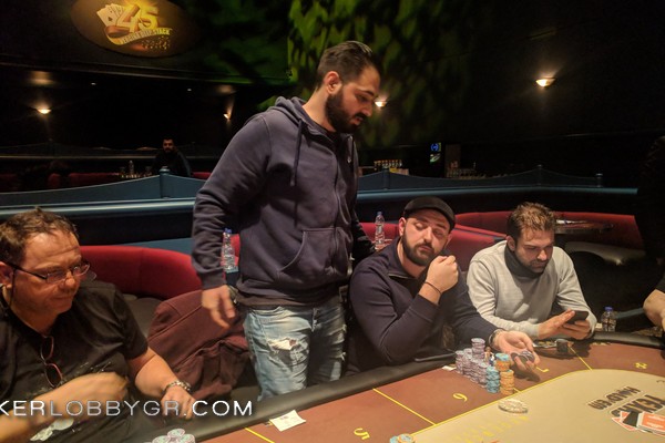 Ο Άλεξ Τζελίλη από το UTG ανέβασε στις 40.000 μάρκες σε blinds 8.000/16.000/2.000 και ο Καρυπίδης Κυριάκος από μεσαία θέση τις έκανε 150.000.