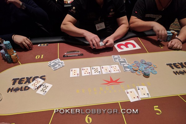 Ο Γκατζας πόνταρε preflop 220000 μάρκες και ο Χατζηβασιλείου μπήκε all in. O Ουσταμπασιδης πέταξε 8αρια κ ο Γκατζας έκανε το call και άνοιξε AJ. O Χατζηβασιλείου άνοιξε A8. Δείτε την συνέχεια στην εικόνα που ακολουθεί.