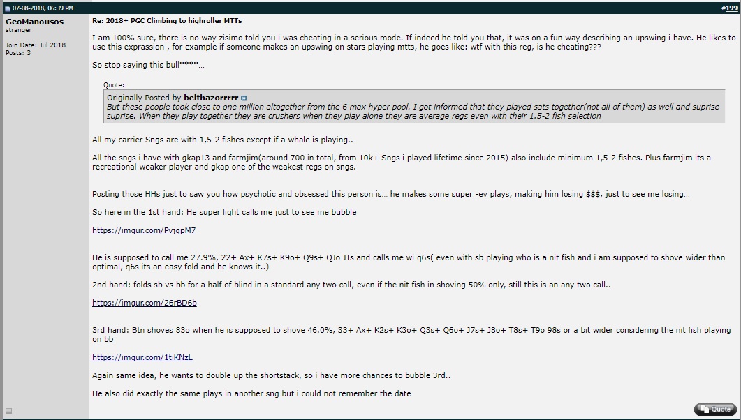 Την επόμενη ημέρα, ένας χρήστης με το ψευδώνυμο “zisimo7”, αυτό που χρησιμοποιεί ο Γιώργος Ζησιμόπουλος στα τραπέζια της PokerStars, εκανε το πρώτο του post στο forum γράφοντας τα εξής: