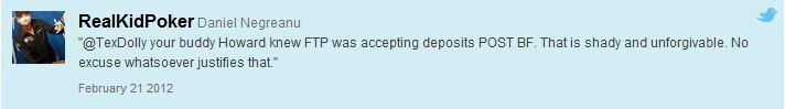 Ο Negreanu φυσικά δεν άφησε ασχολίαστο το κείμενο και είπε στον Brunson πως ο φίλος του ο Howard γνώριζε πως η FTP δεχόταν καταθέσεις μετά τη Μαύρη Παρασκευή και αυτό είναι λυπηρό και ασυγχώρητο.