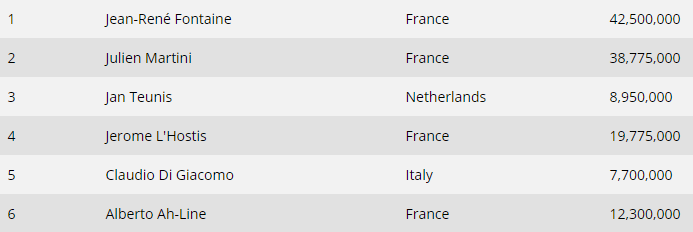 Στο τουρνουά συνεχίζουν πλέον έξι φιναλίστ με τους Γάλλους Jean-Rene Fontaine και Julien Martini να βρίσκονται στις δύο πρώτες θέσεις του chip count έχοντας 42.500.000 και 38.775.000 μάρκες αντίστοιχα. Δείτε αναλυτικά το chip count των φιναλίστ του EPT National της Βαρκελώνης: