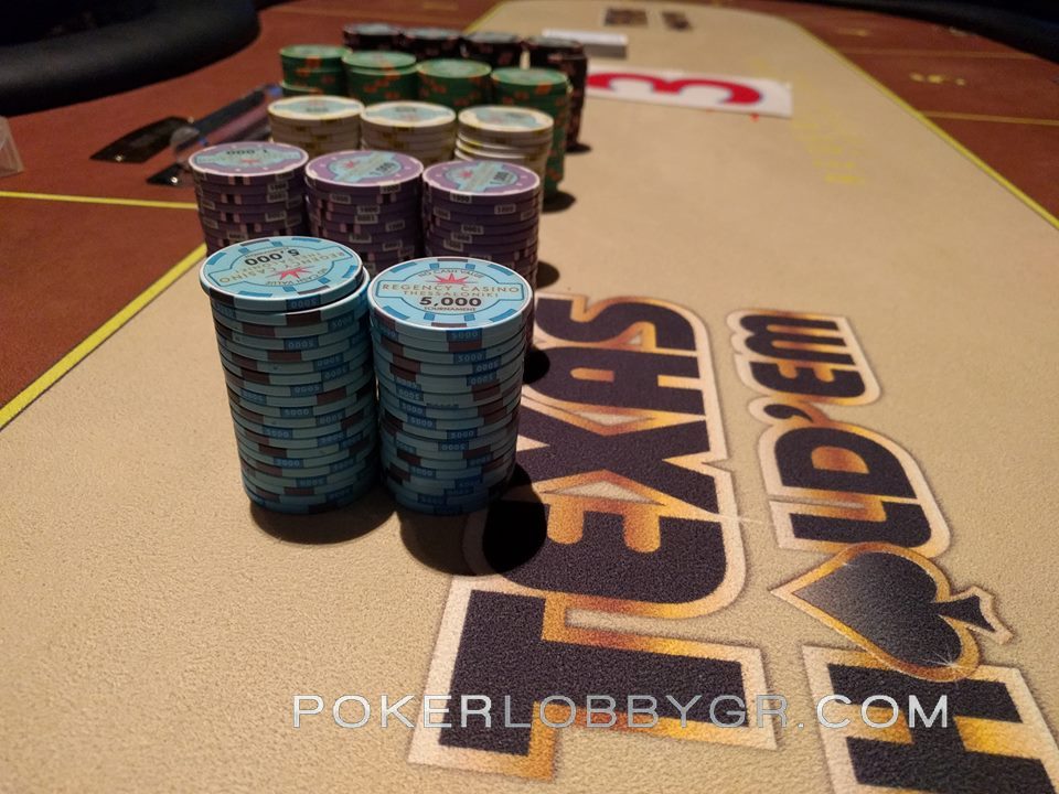 Μία παίκτρια πόνταρε 2500 μάρκες με τα blinds να είναι 500/1000/1000ante. Ο Μπεχράκης έκανε το call και ακολούθησε το call του παίκτη δίπλα του, ενώ ο Γιώργος Μαυρούλιας ανέβασε στις 8.500 μάρκες.