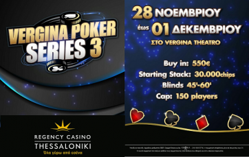 Το Poker Room του Regency Casino Thessaloniki φιλοξενεί το Vergina Poker Series 3 από τις 28 Νοεμβρίου ως την 1η Δεκεμβρίου και τα προκριματικά ξεκινάνε την Τετάρτη 13 Νοεμβρίου.