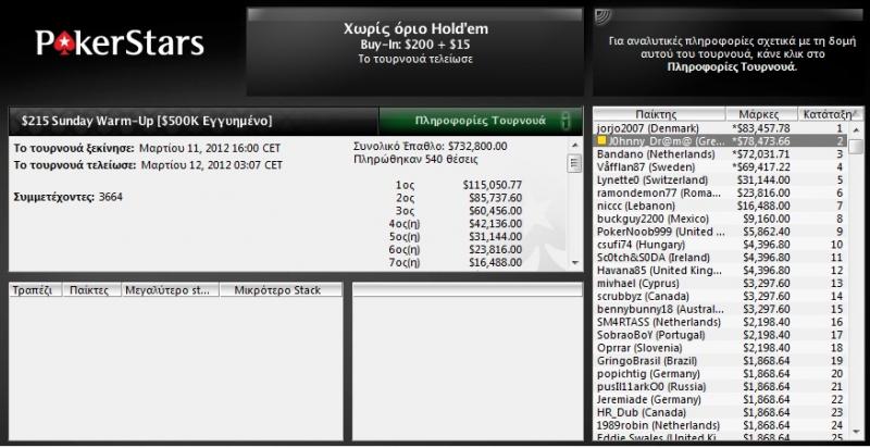 Ο Αλέξης έλαβε μέρος στο Sunday Warm-Up το οποίο συγκέντρωσε 3664 παίκτες και μοίρασε $732,800. Ο “J0hnny_Dr@m@” κατάφερε να φτάσει στο τελικό τραπέζι και προχώρησε σε deal όταν είχαν απομείνει τέσσερις παίκτες. Στη συνέχεια τερμάτισε στην δεύτερη θέση για $78,473!