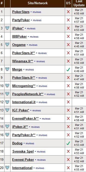 Η Bodog συνεχίζει την πτώση της, στο νούμερο 17 της κατάταξης πλέον. Νωρίτερα φέτος είχε φτάσει μέχρι και τη 12η θέση, αλλά η κατάσχεση του Bodog.com σίγουρα δε βοήθησε την ανάπτυξη της αίθουσας!