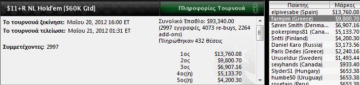 Στο $11+R NL Hold em είχαμε δύο ελληνικές επιτυχίες. Ο “farmjim” βγήκε δεύτερος για $9.800 και ο Πάρης Δέδες 7ος για $2.240.