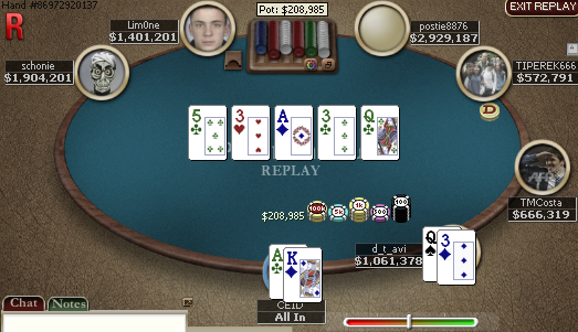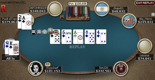 Ο "lelis7" κρατούσε Α-Q ενώ ο τρίτος παίκτης ένα ζευγάρι δεκάρια. Ο "mastoras11" κρατούσε Q-Q και μετά το αδιάφορο board απέκλεισε δύο παικτες, ο "lelis7" κέρδισε $256.