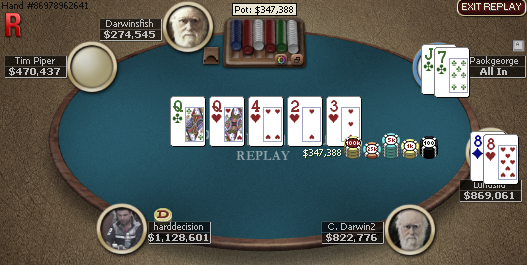 Στη συνέχεια όμως ο "Pizdariki" είχε την τύχη με το μέρος του και λίγο έλειψε να βρεθεί στο rail. Μετά από raise και call το flop άνοιξε Α-J-3 και ο "Pizdariki" έβαλε όλο του το stack στη μέση του τραπεζιού κρατώντας A-Q για να δεχθεί το call από το A-J του αντιπάλου του. Το turn και το river άνοιξαν με δύο τριάρια και έτσι το pot έγινε split.