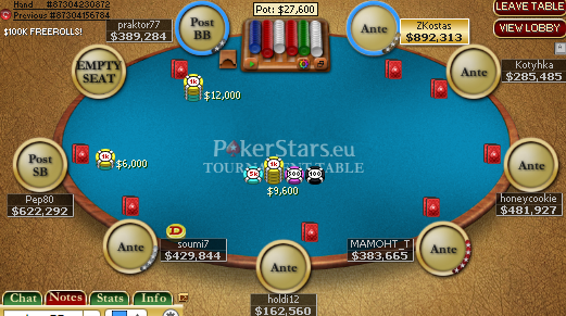 Ο "praktor77" είναι τελευταίος στο chip count με 5 blinds και θα χρειαστεί σύντομα έναν διπλασιασμό για να ελπίζει σε μία υψηλότερη θέση. Ο "ZKostas" είναι chip leader με 2.7 εκατομμύρια μάρκες τη στιγμή που ο δεύτερος έχει 1.2 εκατομμύρια.