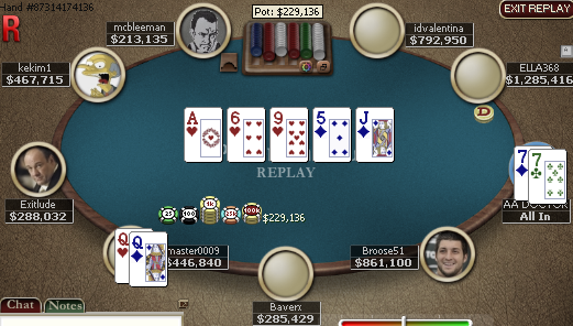 Ο Νάνος κατάφερε να αποκλείσει έναν εκ των αντιπάλων του όταν οι Α-Α που κρατούσε διατήρησαν το πλεονέκτημα τους απέναντι στις Q-Q που άνοιξε στο showdown ο αντίπαλος.