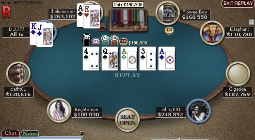 Με 12 blinds o Έλληνας παίκτης ανακοίνωσε all in με Κ-J για να δεχθεί άμεσα το call από τον αντίπαλο του που άνοιξε A-K. Το board άνοιξε με δύο ρηγάδες και έτσι ο "DJ.777" αποχώρησε κερδίζοντας $1.051.