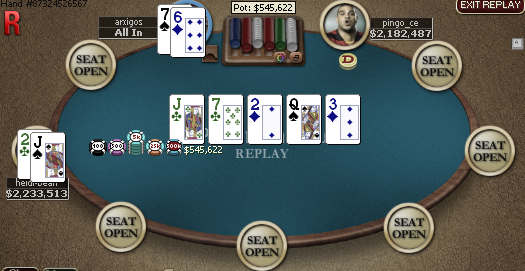 Με 12 blinds o Έλληνας παίκτης έκανε call σε raise του small blind με το flop να ανοίγει J-7-2. Όλες οι μάρκες κατέληξαν στη μέση του τραπεζιού με τον "arxigos" να κρατάει 6-7 ενώ ο small blind άνοιξε J-2. Το turn και το river δεν άνοιξαν με κάποιο επτάρι και έτσι ο "arxigos" αποχώρησε στην 3η θέση με έπαθλο $20.424.