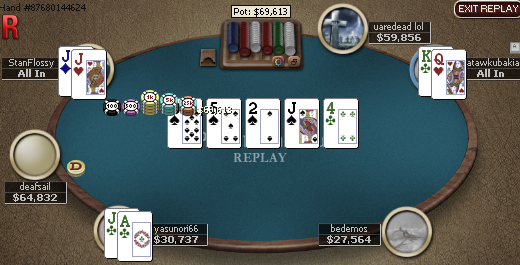 Ο UTG έκανε min raise ενώ ο button με 17 blinds ανακοίνωσε all in. Ο Έλληνας παίκτης με λιγότερο από 20 blinds έκανε το call με J-J από το big blind ενώ ο UTG ακολούθησε κρατώντας Α-Α. Ο button άνοιξε 10-10 όμως το board έδωσε το full house στον "doulas12" που ανέβηκε στην 2η θέση του chip count με 51 παίκτες να απομένουν.